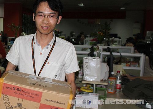 制藥網的毛華不僅業績佳,運氣也不錯,抽到本期大獎——掛燙式熨衣機