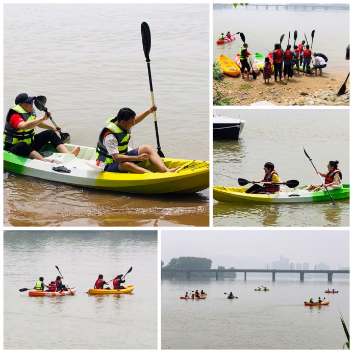 第一項(xiàng):皮劃艇。在美麗的富春江上,兩人一舟,劃起雙槳,好不自在。但如果想要控制好你的“艇”,還要用力劃哦~