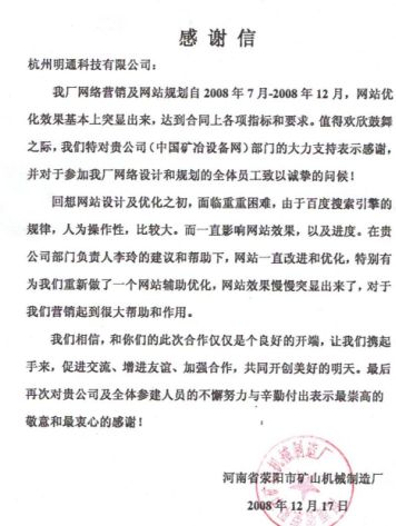 河南滎陽礦山機(jī)械制造廠享有中國礦冶設(shè)備網(wǎng)的網(wǎng)絡(luò)推廣服務(wù)后,網(wǎng)站優(yōu)化效果突顯,促進(jìn)企業(yè)銷售業(yè)績的快速增長。滎陽礦山機(jī)械特致信對中國礦冶設(shè)備網(wǎng)表達(dá)了感謝之意。