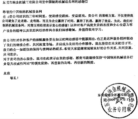 在與貴公司結識的三年時間里,使我感受頗深,受益匪淺。貴公司的策劃方案,不僅使的我公司避免了走老路、走彎路,而且為企業贏得了時間,贏得了機遇,贏得了效益。為此,我們對制藥機械設備網,對詹玉明經理表示衷心的感謝!這種對客戶高度負責的態度和全心全意為客戶服務的精神以及雷厲風行的作風令我們深感敬佩,并值得我司學習。