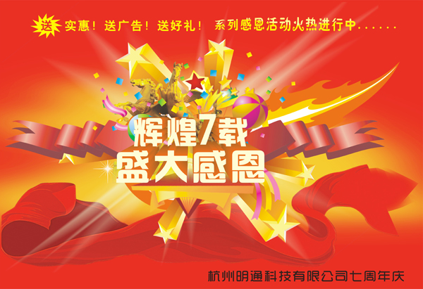 值此明通科技成立7周年之際,明通及子公司百站網(wǎng)絡(luò)引領(lǐng)旗下網(wǎng)站傾情回饋所有支持和關(guān)心公司發(fā)展的用戶,特別開展“送實惠!送廣告!送好禮!”系列感恩活動,優(yōu)惠力度空前!優(yōu)惠詳情,請登錄明通百站旗下各行業(yè)網(wǎng)站,撥打廣告熱線咨詢或索取資料!