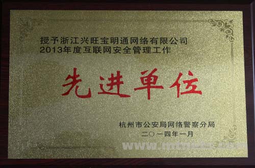 1月7日,2013年杭州互聯(lián)網(wǎng)企業(yè)新春會(huì)暨杭州市網(wǎng)絡(luò)協(xié)會(huì)年會(huì)在杭州召開,會(huì)上表彰了2013年在互聯(lián)網(wǎng)安全管理工作中的先進(jìn)單位和先進(jìn)個(gè)人。會(huì)議上,杭州市公安局網(wǎng)絡(luò)警察分局對在2013年度中成績突出的20家單位予以通報(bào)表彰并進(jìn)行授牌,浙江興旺寶明通網(wǎng)絡(luò)有限公司榮獲“2013年度互聯(lián)網(wǎng)安全管理工作先進(jìn)單位”稱號(hào)。