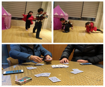 午休時(shí)間,寶貝們和大人們分成兩派,各自開(kāi)啟娛樂(lè)耍玩。這不,哥哥教妹妹在房間榻榻米上練武,打拳,那妹妹呢?難道是看了十分火熱的《這就是街舞》節(jié)目之后,想要教哥哥breaking(地板舞),哈哈!而大人們“摒棄”低頭玩手機(jī),集體打起了牌。一邊是孩童們自成一體“表演”,另一邊是大人們嗨起的“牌場(chǎng)”,好不熱鬧......