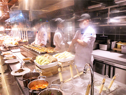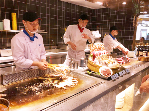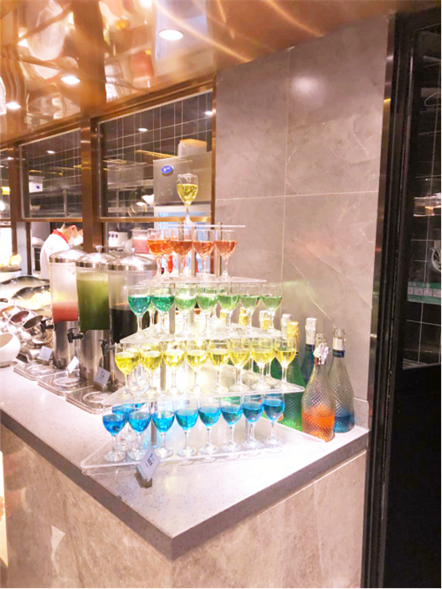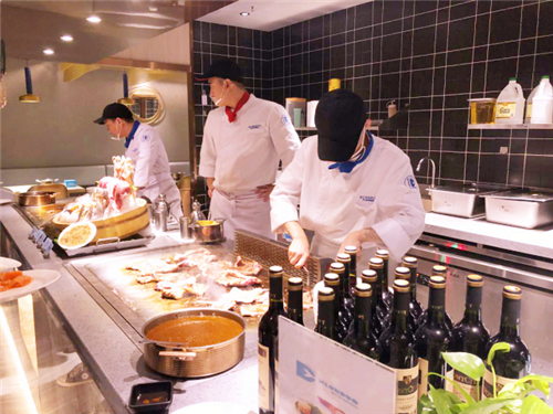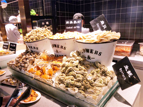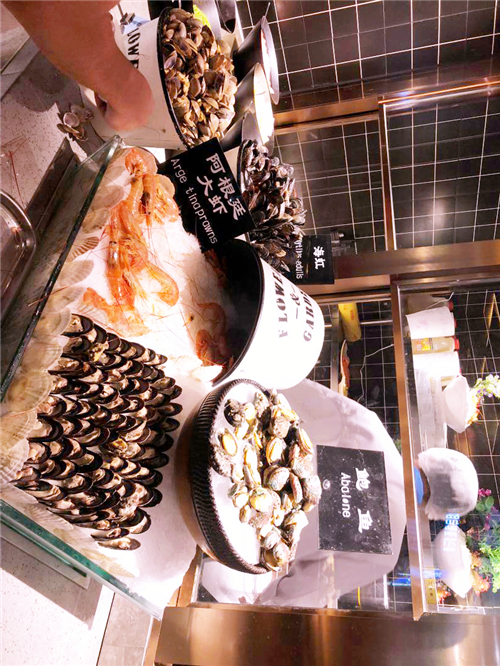 鮮嫩的阿根廷大蝦、滋補(bǔ)的鮑魚、鮮艷的蟹、各種扇貝生蠔小龍蝦、剛切的三文魚、冰山蚌以及專業(yè)廚師操刀烹飪的魷魚和牛排都在向我們招手,仿佛在說:我們已經(jīng)洗干凈躺好啦,快來吃我呀!