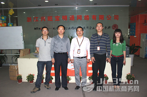 合影人物:興旺寶明通副總經理吳立灶、滕州市經信局局長韓業河、興旺寶明通總經理陳勝明、中國機床商務網站長蔣鑫、興旺寶明通對外關系主管何立娜